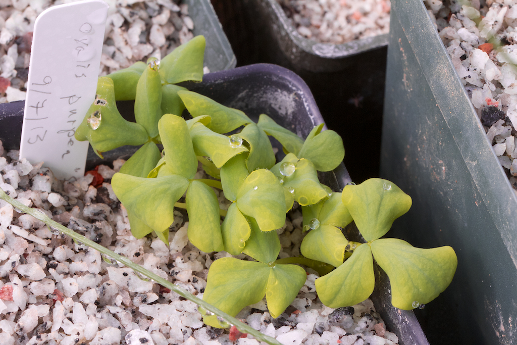 On September 4, I decided spring would officially start for these plants. I brought the pots out of the basement and put them in the greenhouse and I potted up the many Oxalis that had arrived along with Ferraria, Lachenalia, Albucca, Zephyranthes, Tulbaghia, and Cyrtanthus (Let me put in a shameless plug for the Pacific Bulb Society, which has been the source many bulbs at this point. They have a very active bulb exchange with a wide variety of bulbs and seeds). It has been wonderful to see how rapidly the bulbs responded to water. Just about everything that I took to the basement with deep foreboding has come back in style. And all the new little oxalis bulbs are growing rapidly, though none more so than the Wood Sorel pictured at the intro to this posting. It’s acting like it’s late for the flower awards and wants to get its bid in early. The giant shamrock leaves provide a pretty backdrop for the flowers.
